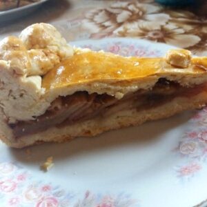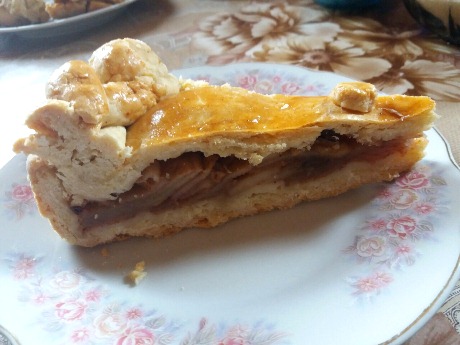 - Brašno, maslac, žumanjak, šećer, sol, vodu umijesiti u glatko tijesto, ostaviti na hladnom min 30 min. Za to vrijeme pripremiti jabuke. Operite ih, po želji (ili potrebi, kupovne) ogulite pa naribajte ili isjecite na tanke listiće. Dodajte ostale začine, orahe ako volite i vratite se tijestu. Nešto više od pola tijesto razvaljati na 3-4 mm debljine, obložiti kalup promjera 26cm i njegov rub također. Zatim razvaljajte ostatak, pa s modlama izrežite dijelove ili nasijecite trake pa pletiti kao na slici. Poigrajte se po želji s izgledom jer varijacija je bezbroj. Tijesto u kalupu pospite mrvicama pa stavite na njih jabuke. Pokrijte trakama ili priređenim tijestom po želji i premažite umućenim žumanjkom. Pecite u ugrijanoj pećnici na 200°C oko 45 minuta. Možete služiti i vruće uz sladoled od vanilije na pr. ili hladno. Po želji!